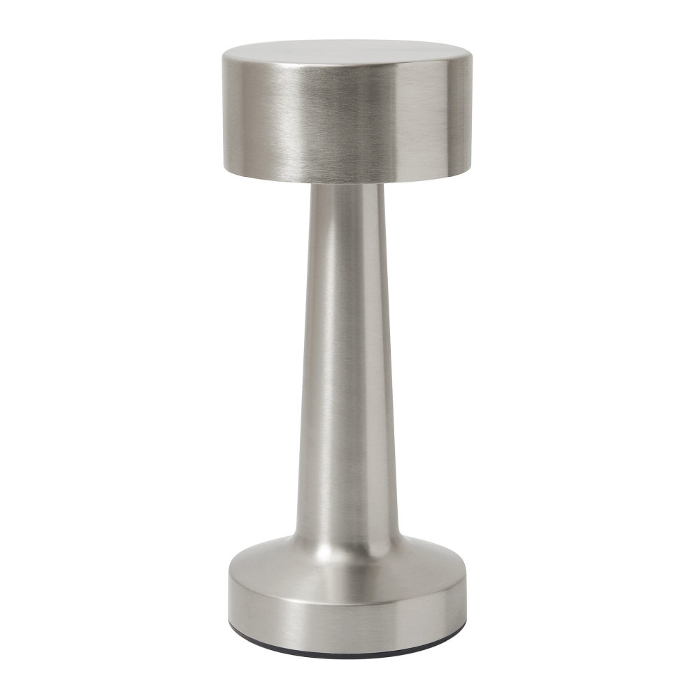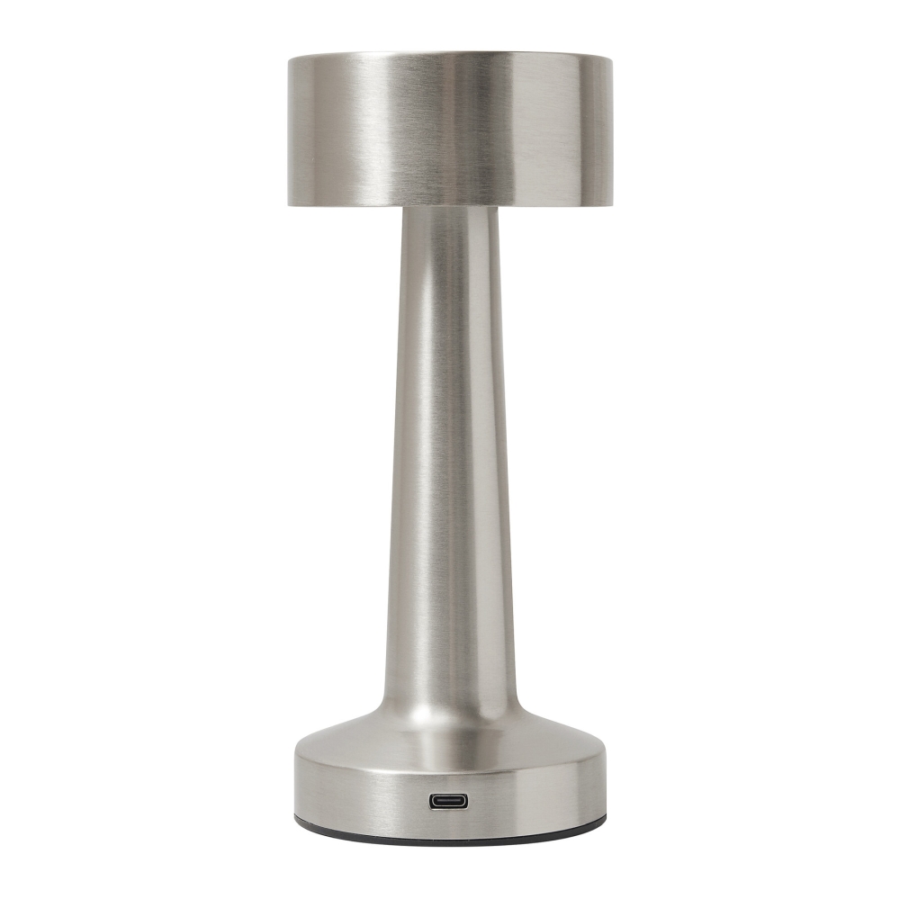 Stolní lampa z nerezové oceli, 3 režimy svícení (teplé, bílé a teplé bílé světlo), dotykový vypínač a volba režimu svícení, včetně nabíjecího kabelu USB s konektorem USB typu C (délka cca 100 cm), tlačítko zapnutí/vypnutí na spodní straně, všestranné použití díky integrované lithiové baterii 800 mAh, 4 protiskluzové nožičky na spodní straně, baleno v krabičce. Rozměry: O9 x 21,5 cm
