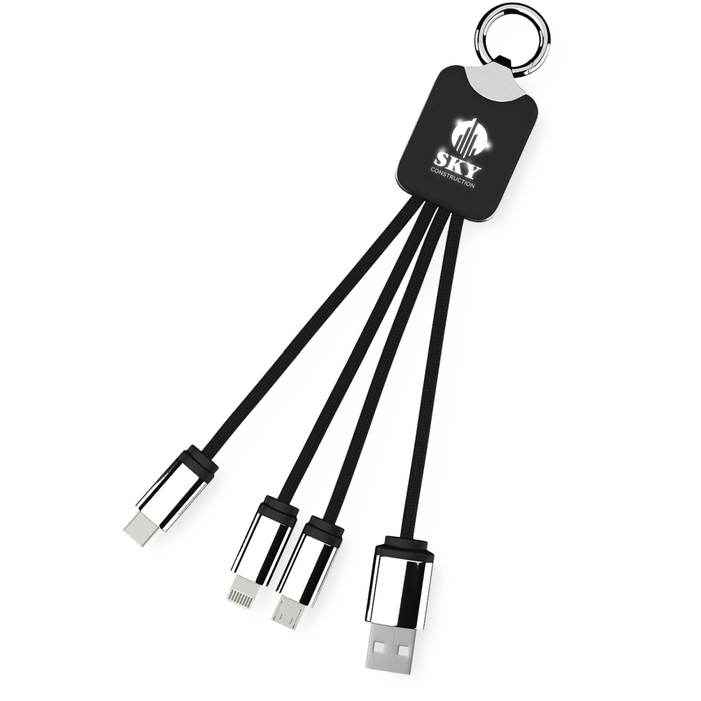 Dobíjecí kabel se světelným logem, gumovým povrchem, kovovými doplňky a třemi výstupními konektory (USB-C, Android, iPhone). Lze nabíjet až tři zařízení současně. Délka kabelů (včetně zástrček): 10 cm. Recyklovaný PET kabel a obal jsou vyrobeny z recyklovaného papíru a recyklovaného plastu. Rozměry: 16 x 2,6 cm