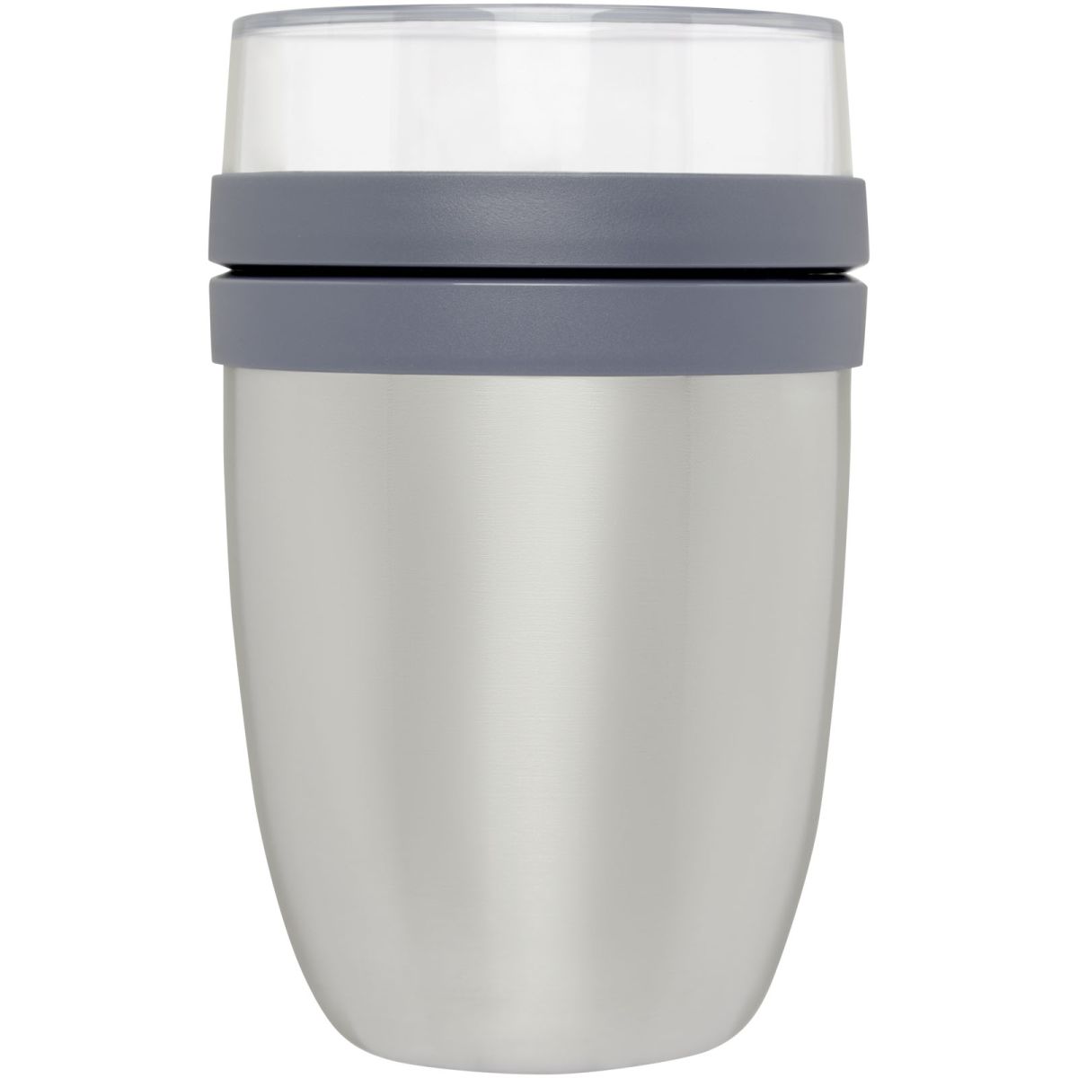 Termo obědový box s dvěma navzájem oddělenými přihrádkami. Obě přihrádky mají samostatné víčko, takže se jejich obsah nepromíchá. Udrží potraviny teplé až 8 hodin a studené až 12 hodin. Abyste měli jistotu, že jídlo si co nejdéle udrží požadovanou teplotu, doporučujeme ještě před naplněním vypláchnout box horkou nebo naopak ledovou vodou. Objem horní průhledné nádoby je 200 ml, což znamená, že může obsahovat asi 75 gramů pevných potravin. Objem spodní nádoby je 500 ml. Vyrobeno z odolného materiálu. Vnější část boxu zůstává chladná a suchá. Doporučuje se mýt ručně. Plastové části víčka lze mýt v myčce. Nepropustná. Neobsahuje BPA. Rozměry: 16,5 x O 10 cm.