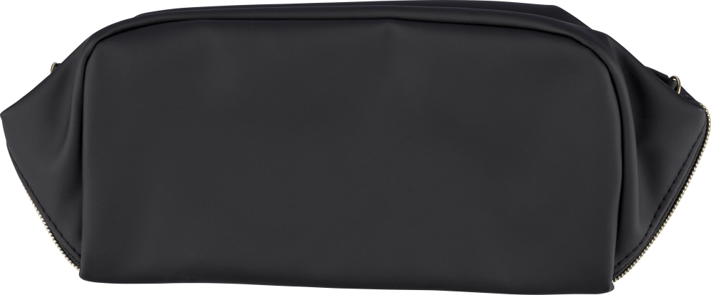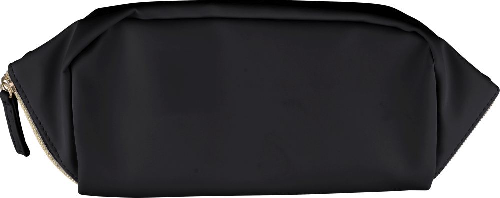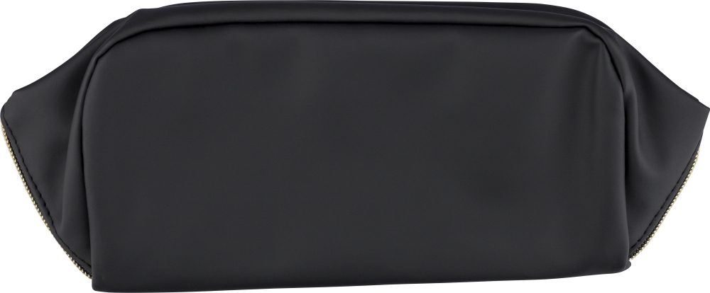 Toaletní taška z recyklovaného PU s centrálním zipem pro široké otevírání. Má krátké ucho, prostorný interiér se čtyřmi přihrádkami, včetně jedné vnitřní kapsy na zip. Podšívka z recyklovaného materiálu 210D a uvnitř jeden recyklovaný štítek. Rozměry: 12 cm x 22 cm