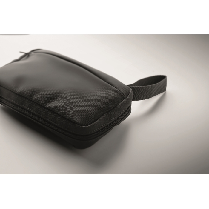 Toaletní taštička z 600D RPET s PU zátěrem, síťovinou RPET a podšívkou 210D RPET. Hlavní kapsa na zip vpředu, vnitřní síťovina a otevřené kapsy. Rozměry: 22 x 4 x 13 cm