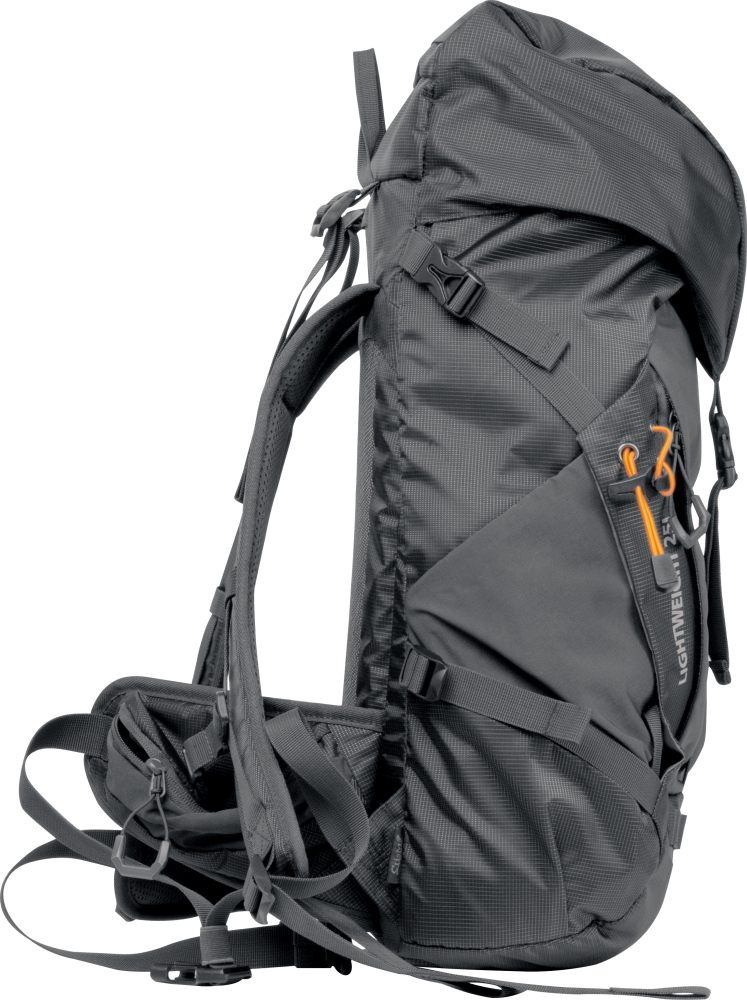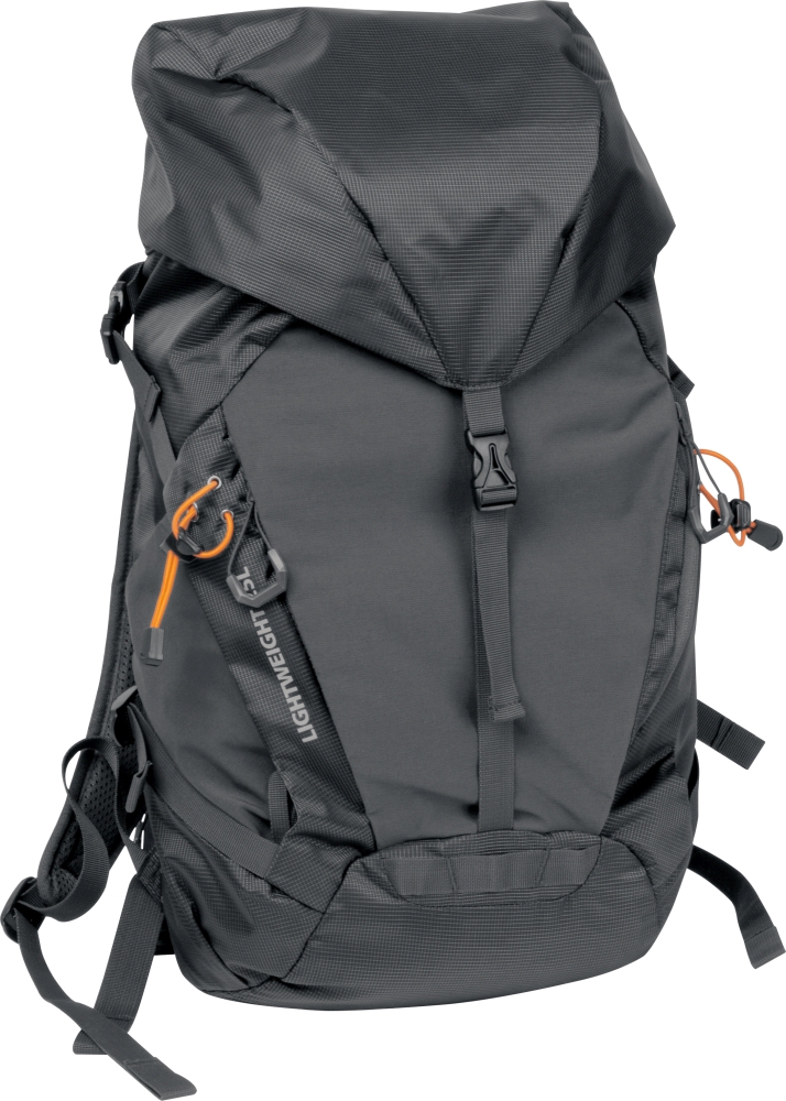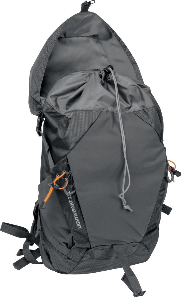 Pevný turistický batoh s ergonomickým bederním pásem, kapacita 25 L, vyrobená z materiálů PA, PES a EVA, skapsami na ochranu před deštěm na spodní straně a na zadním polstrování. Rozměry: 30 x 18 x 56 cm