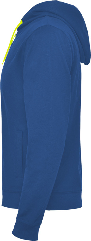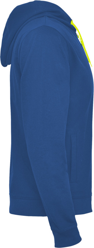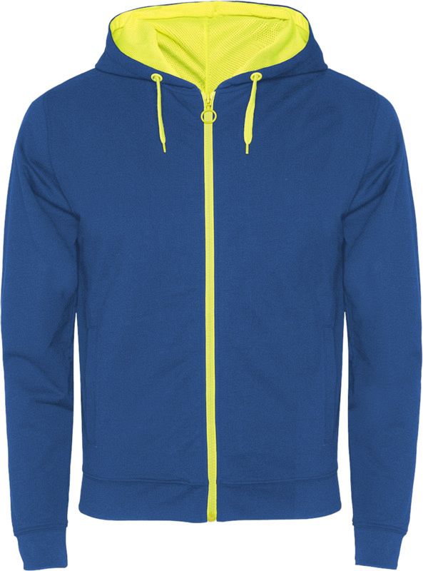 Mikina z nečesaného fleecu se zářivě barevnými detaily. Středový zip s kontrastním táhlem. Kapuce s podšívkou z mikroperforované polyesterové látky v kontrastní zářivé barvě. Stahovací šňůrka a kovová očka v kontrastní zářivé barvě. 1 × 1 žebrované manžety a pas. Dvě přední kapsy s širokým lemem. Zesílené kryté švy na vnitřním límci. Odnímatelný štítek. 60% Bavlna, 40% Polyester, 280 g/m2.