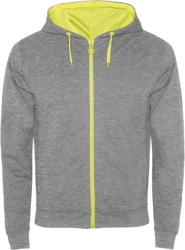 Mikina z nečesaného fleecu se zářivě barevnými detaily. Středový zip s kontrastním táhlem. Kapuce s podšívkou z mikroperforované polyesterové látky v kontrastní zářivé barvě. Stahovací šňůrka a kovová očka v kontrastní zářivé barvě. 1 × 1 žebrované manžety a pas. Dvě přední kapsy s širokým lemem. Zesílené kryté švy na vnitřním límci. Odnímatelný štítek. 60% Bavlna, 40% Polyester, 280 g/m2.
