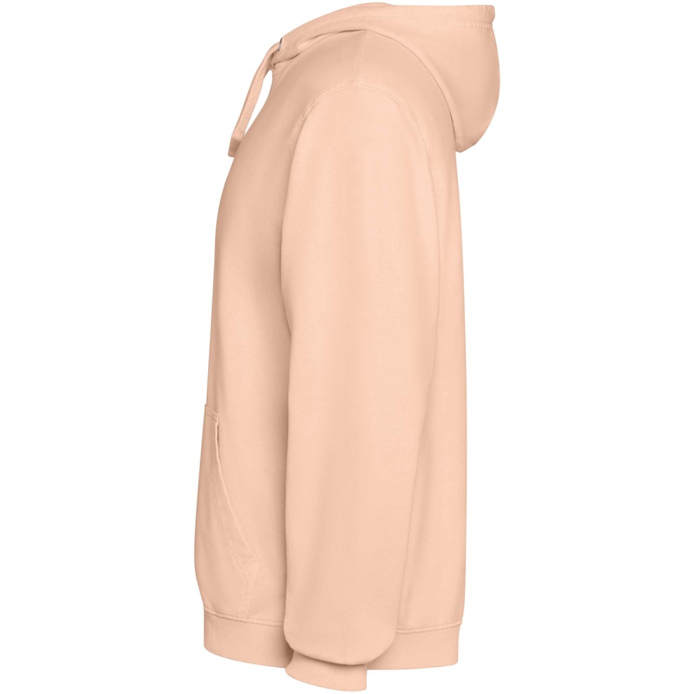 Unisex mikina s kapucí se sepraným vzhledem. Žebrované manžety a lem 2 × 1. Kapuce s podšívkou z jednolícního žerzeje v tónu látky se sladěnými plochými šňůrkami. Krycí steh v tónu látky u krku. Klokaní kapsa.