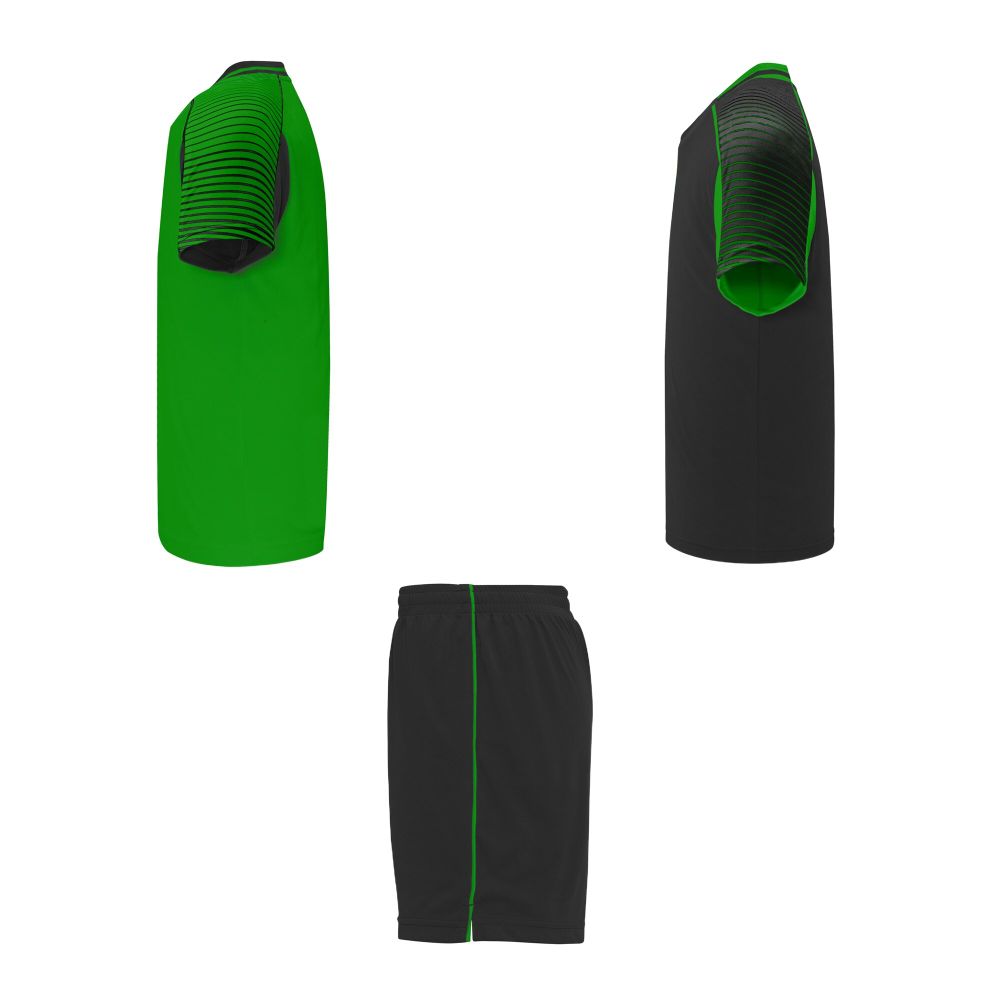 Sada obsahuje 2 trička a 1 šortky. Barva druhého trička je v opačném provedení než u prvního. Technická a prodyšná látka. Trička s potištěnými poloraglánovými rukávy. Kulatý výstřih s trikotem na zádech. Elastický pas u šortek s odpovídající vnitřní stahovací šňůrkou s bezpečnostním prošíváním. Šortky s kontrastním postranním pruhem a rozparky na spodním lemu. Odnímatelný štítek.