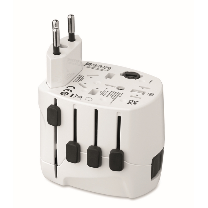 SKROSS® PRO — univerzální třípólový cestovní adaptér pro Evropu, USA/Japonsko, Austrálii a Čínu. Uzemněný pro větší bezpečnost. Rozměry: