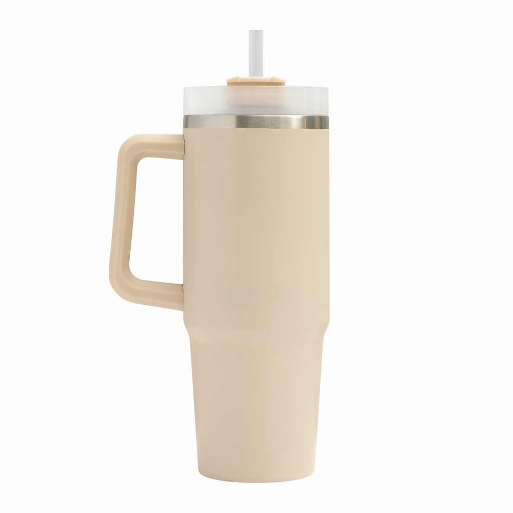 Vakuový kelímek na pití z nerezové oceli, s praktickým držadlem, průhledným plastovým víčkem s bezpečným šroubovacím uzávěrem, silikonovým těsnícím kroužkem, otvorem na pití se šroubovacím uzávěrem a průhledným brčkem, objem 900 ml. Rozměry: o 8,8 x 24 cm