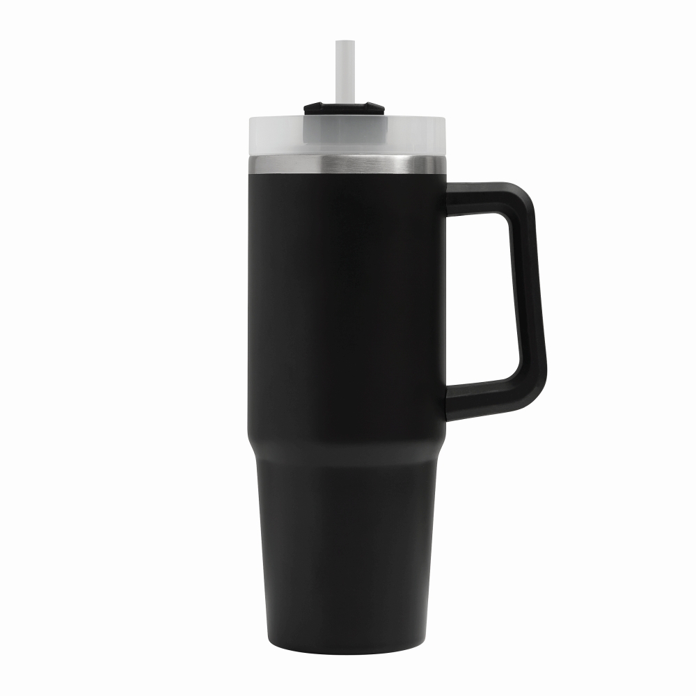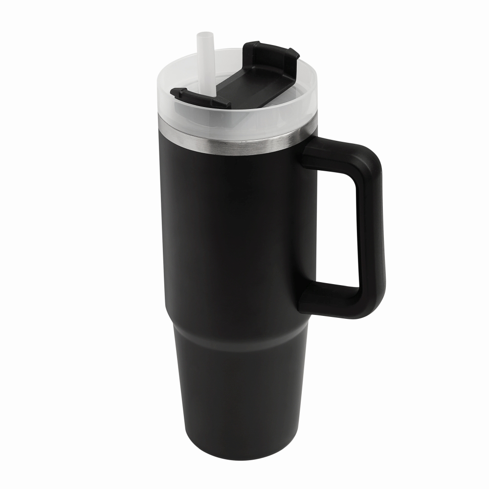 Vakuový kelímek na pití z nerezové oceli, s praktickým držadlem, průhledným plastovým víčkem s bezpečným šroubovacím uzávěrem, silikonovým těsnícím kroužkem, otvorem na pití se šroubovacím uzávěrem a průhledným brčkem, objem 900 ml. Rozměry: o 8,8 x 24 cm