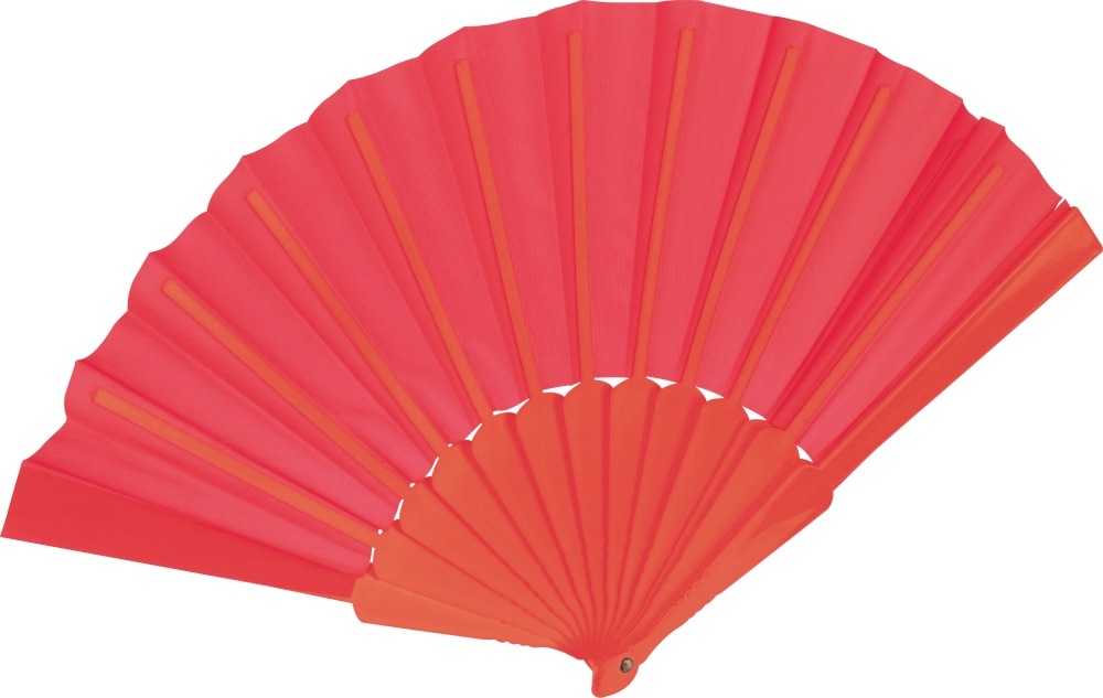 Vějíř z plastu a polyesteru na chlazení na cestách. Rozměry: 42 x 3 x 22,5 cm