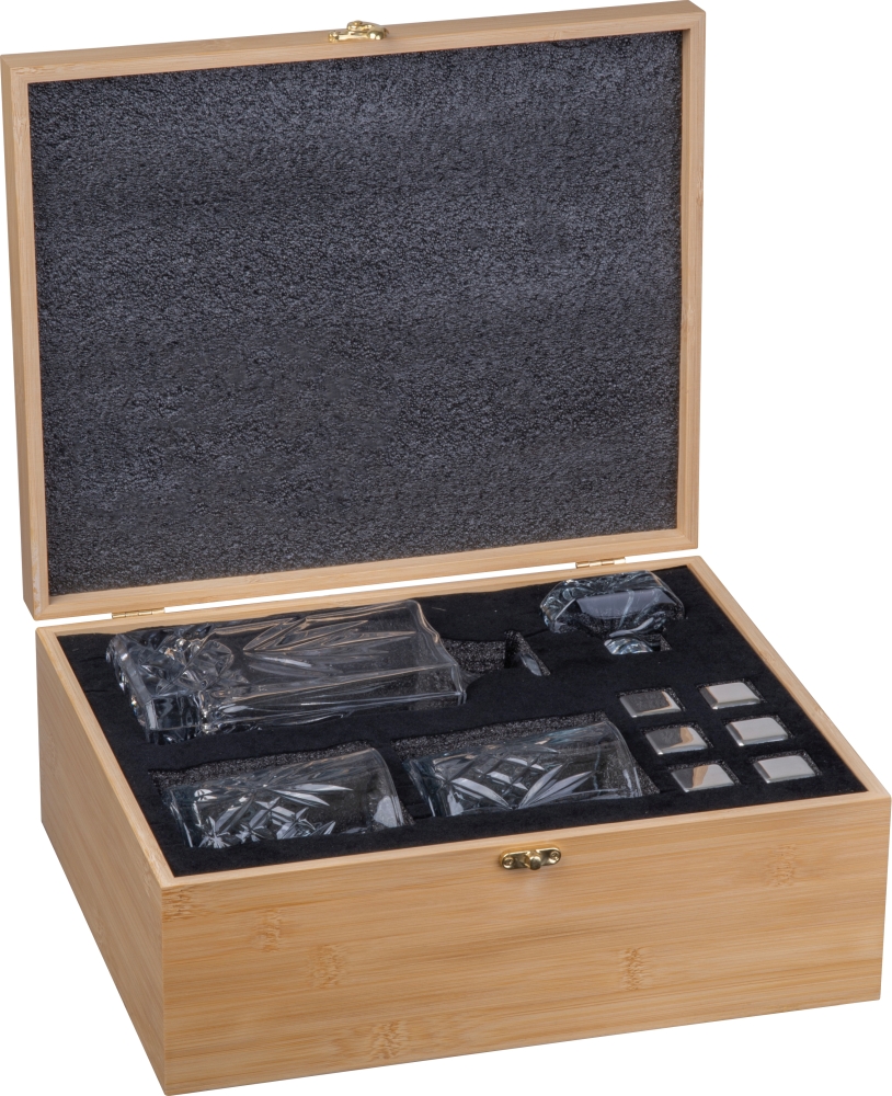 Prémiová whiskey sada s karafou a dvěma pohárky z borosilikátového skla, včetně 6 nerezových kostek ledu v bambusové krabičce. Sada s 1 skleněnou karafou 800 ml a 2 skleněnými pohárky, každý s objemem 250 ml. Rozměry: 31,5 x 25,5 x 13 cm