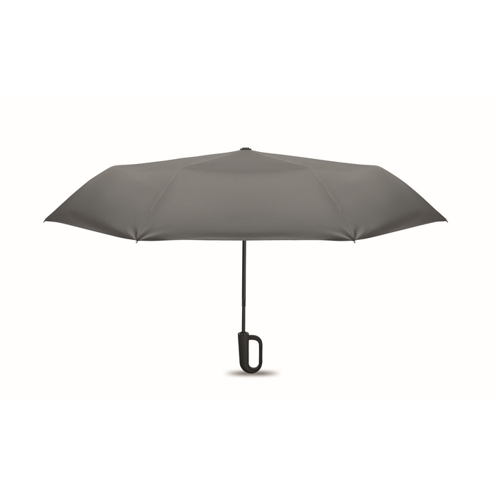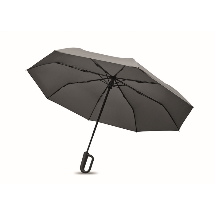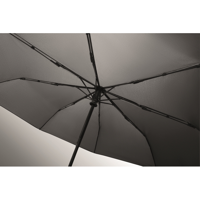 Skládací 21 větruodolný deštník s černě pokovenou tyčí. Sklolaminátová žebra. Panely z pongee 190T RPET. Rukojeť s karabinou a pogumovanou úpravou. Automatické otevírání a zavírání. Včetně pouzdra.Rozměry: O99,5 x 48cm