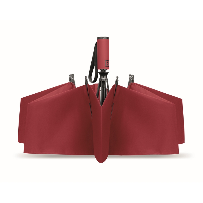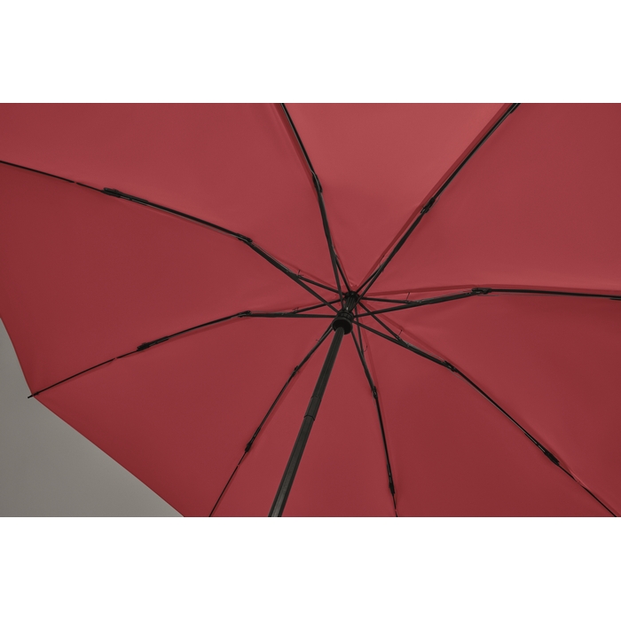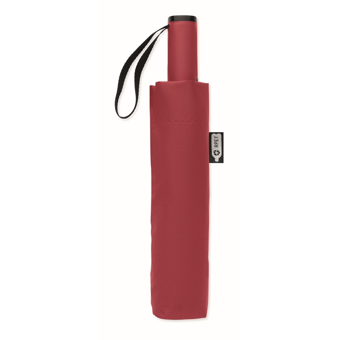 23palcový skládací větruodolný deštník ze 190T RPET pongee v obalu. Automatické otevírání a zavírání. Černá pokovená tyč, žebra ze sklolaminátu a rukojeť z ABS s gumovou povrchovou úpravou. Rozměry: O107 x 62 cm