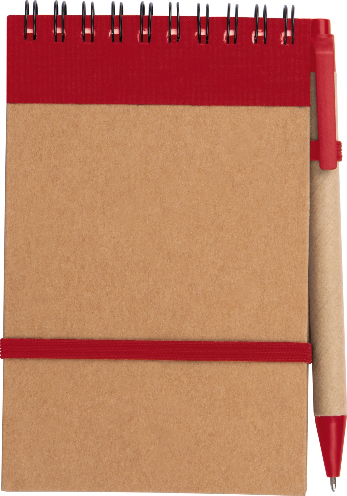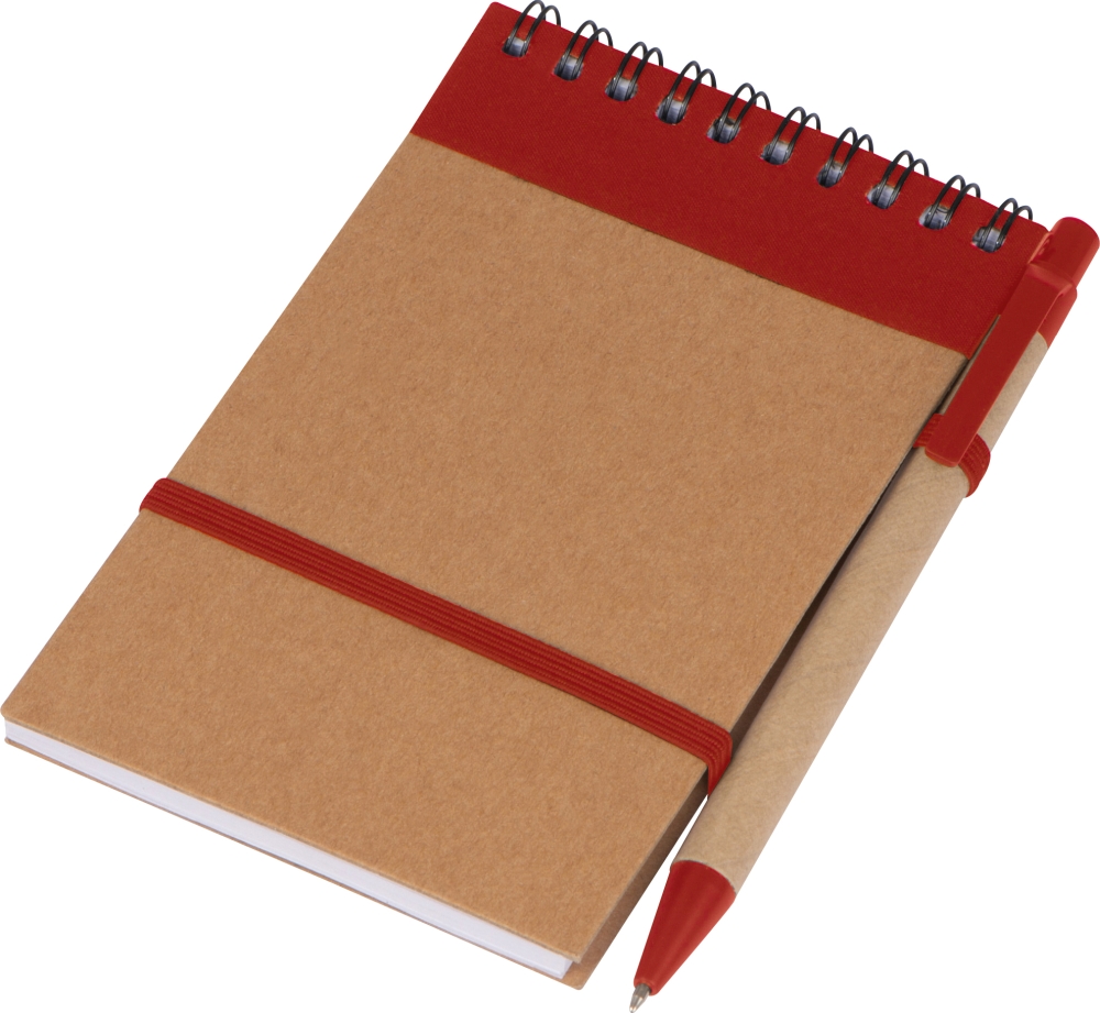 Zápisníček s kroužkovou vazbou, linkovanými listy a propiskou, červená