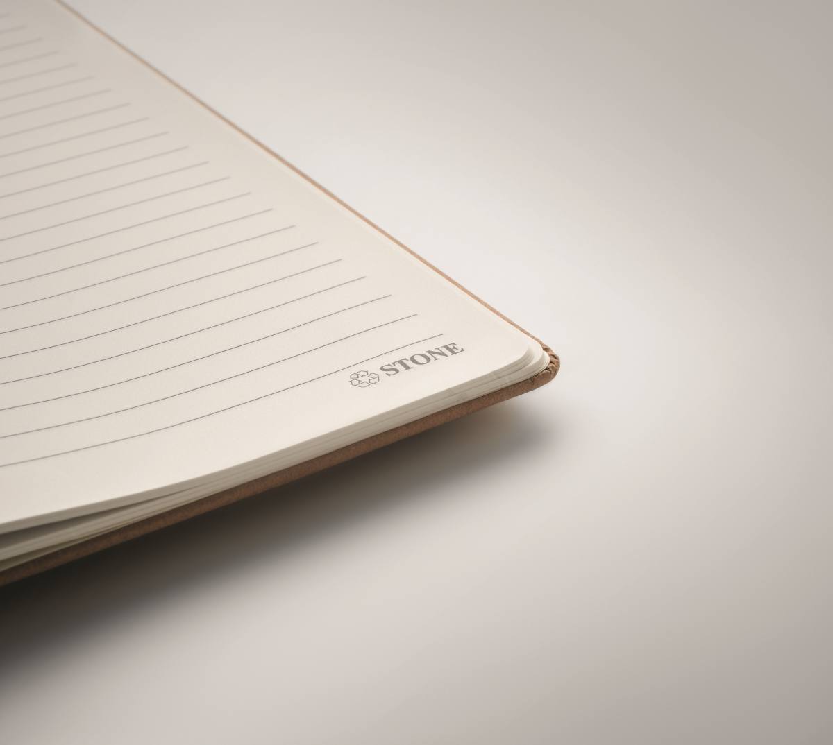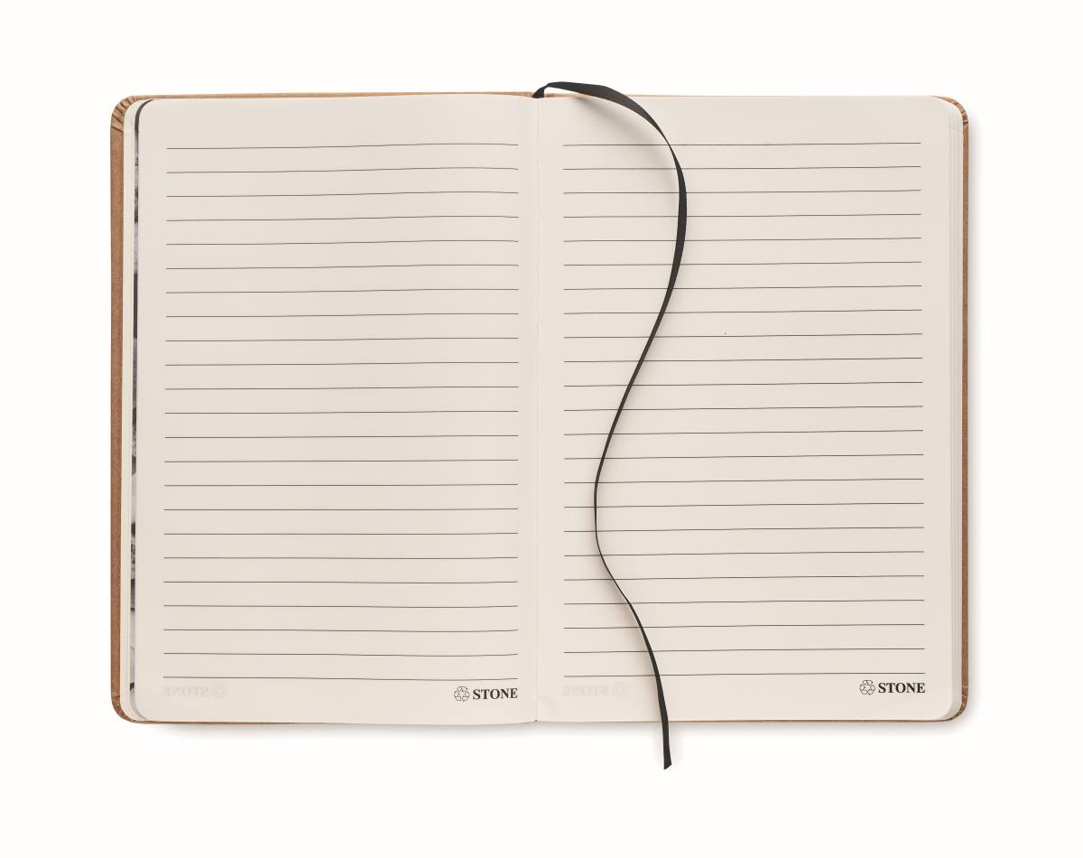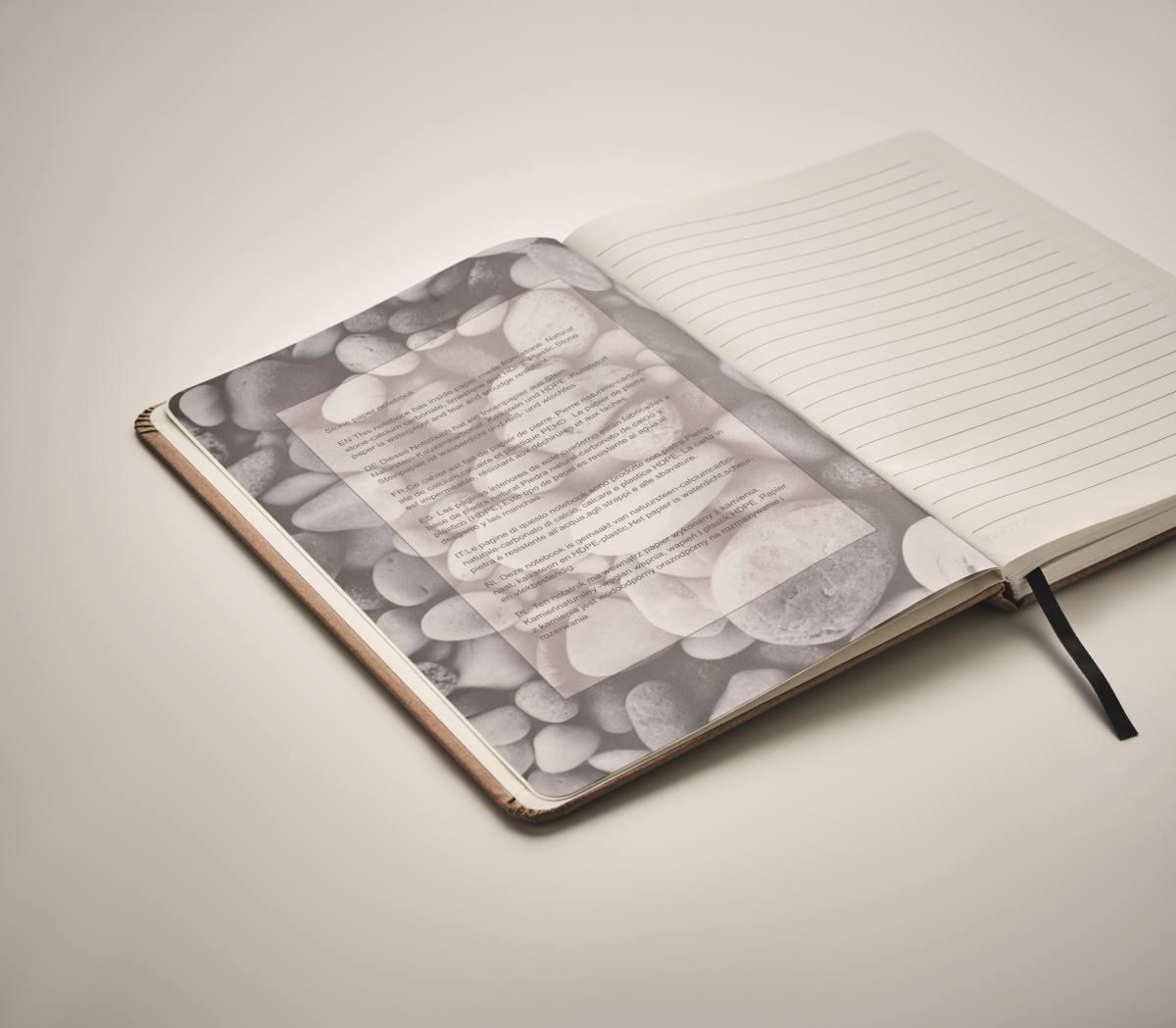 Zápisník A5 s obálkou z recyklovaného kartonu. 160 linkovaných stran z kamenného papíru (80 listů). Zavírání na gumičku a záložka. Rozměry: 21x14.5x1.3cm