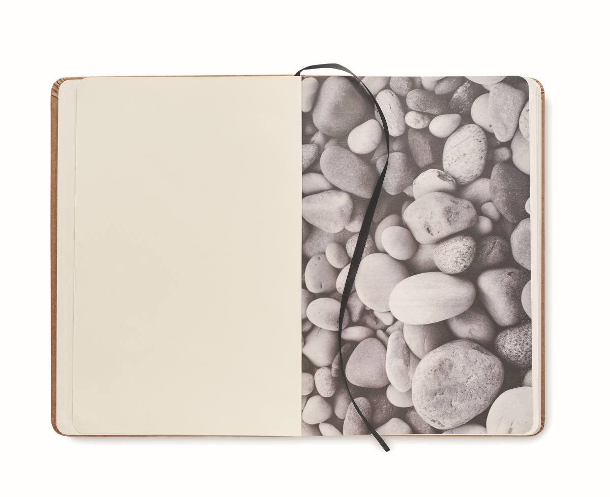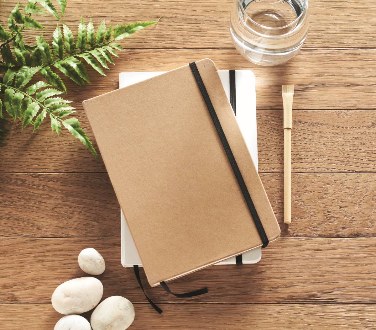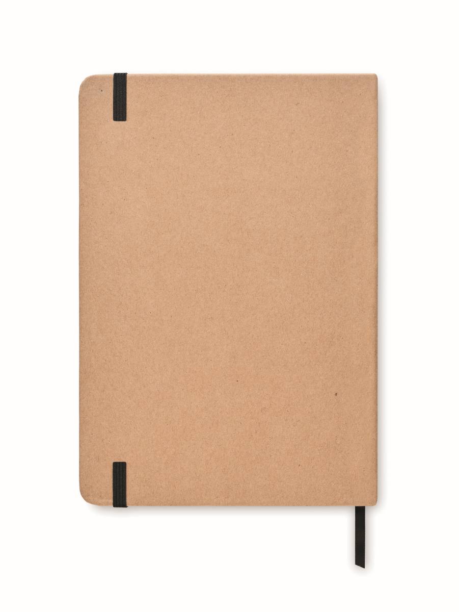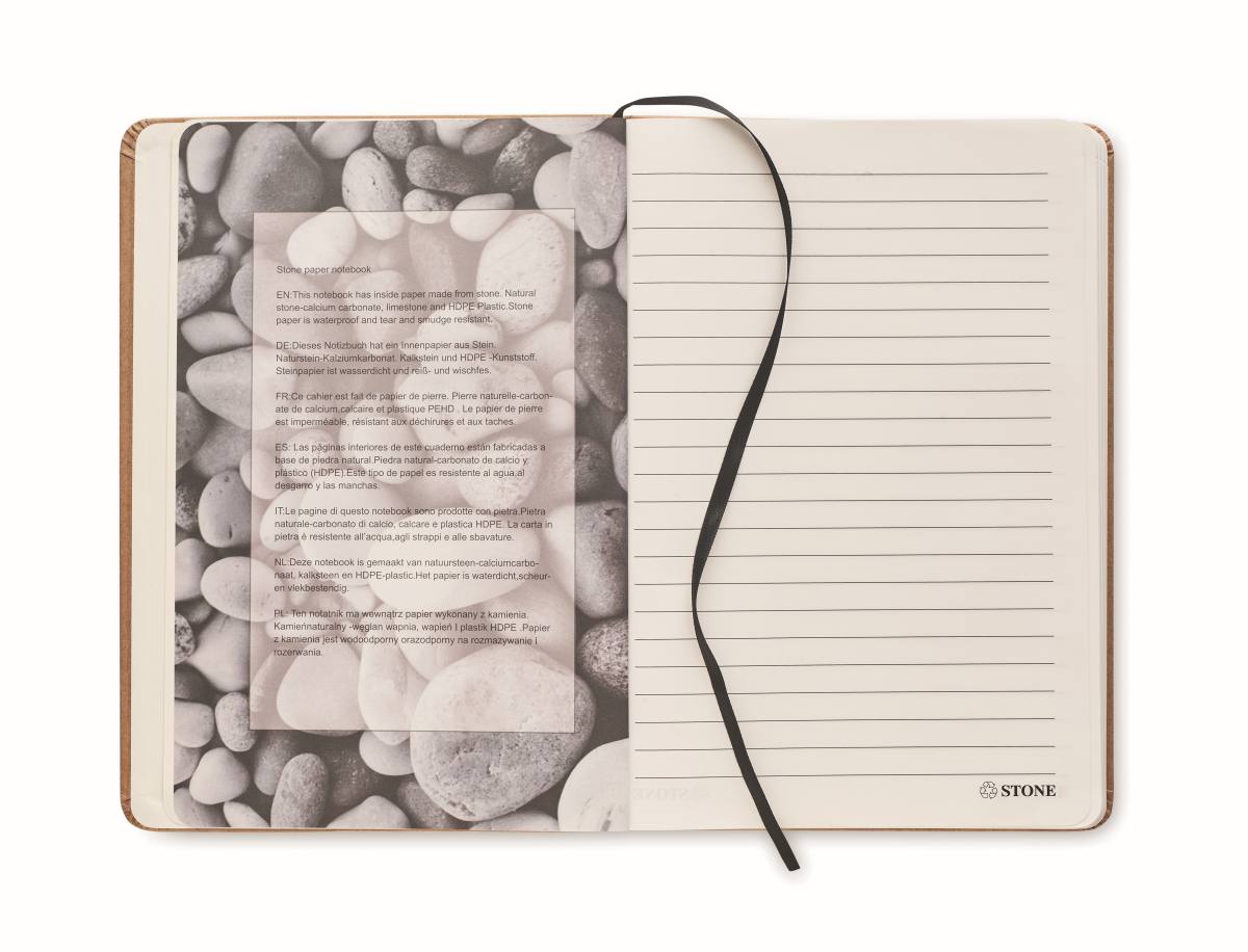 Zápisník A5 s obálkou z recyklovaného kartonu. 160 linkovaných stran z kamenného papíru (80 listů). Zavírání na gumičku a záložka. Rozměry: 21x14.5x1.3cm