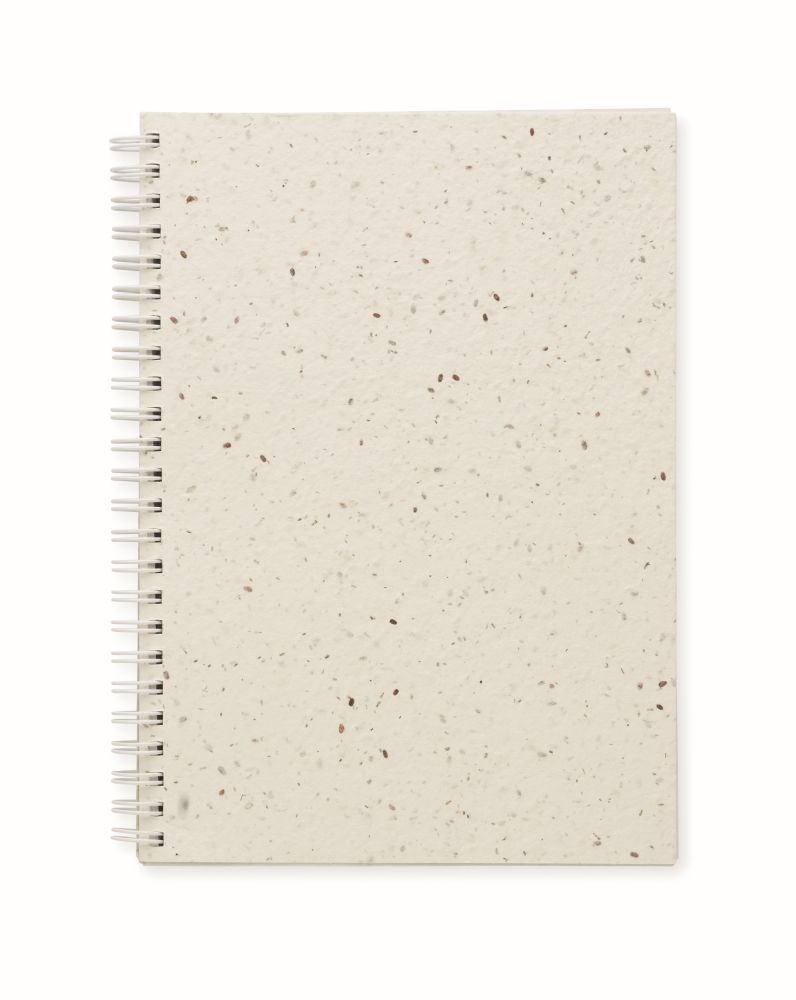 Zápisník A5 s papírovými deskami se semínky. Kroužková vazba. 200 linkovaných stran z recyklovaného papíru (100 listů). Rozměry: 21x16x1,2 cm