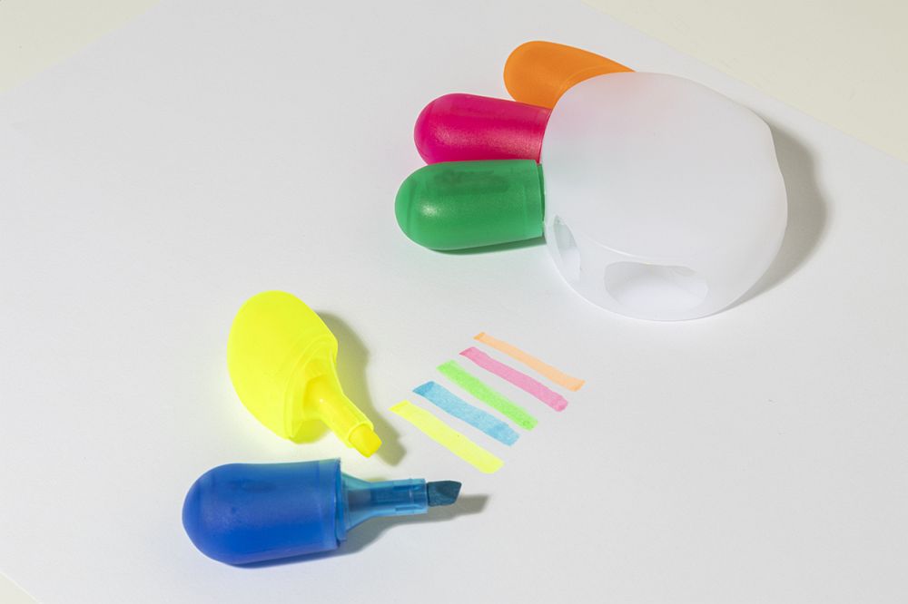Zvýrazňovač ve tvaru ruky s 5 barvami z recyklovaného ABS plastu. Rozměry: 10 x 8 x 1,8 cm.